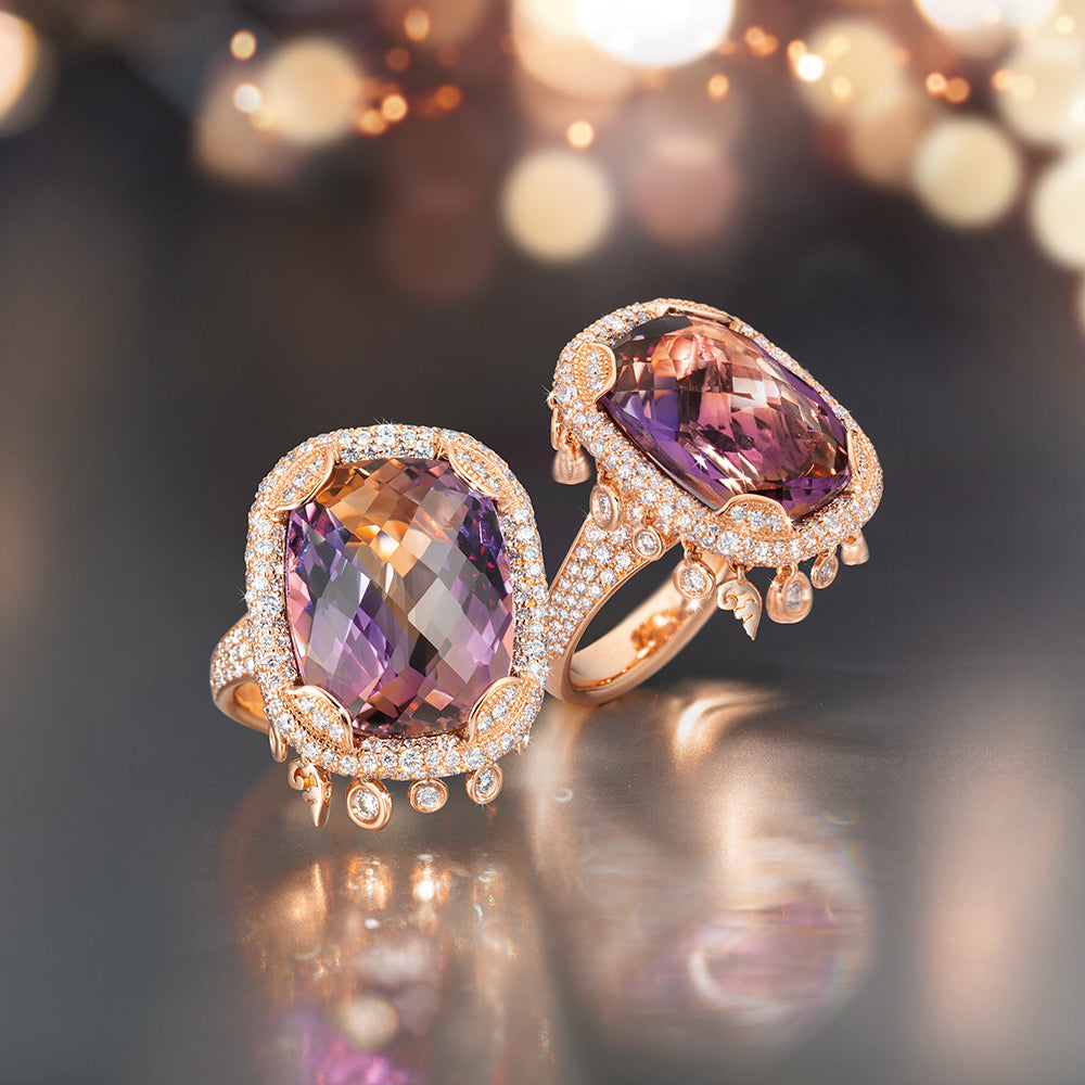 Pure Leidenschaft für traumschönen Schmuck. Der Cocktailring Passione demonstriert höchste Handwerkskunst. Eingebettet in zartes Roségold und begleitet von insgesamt 279 Brillanten entfaltet der antik facettierte Ametrin seinen feurigen Zauber. Ein Meisterstück, handgefertigt in unserer gläsernen Manufaktur.
