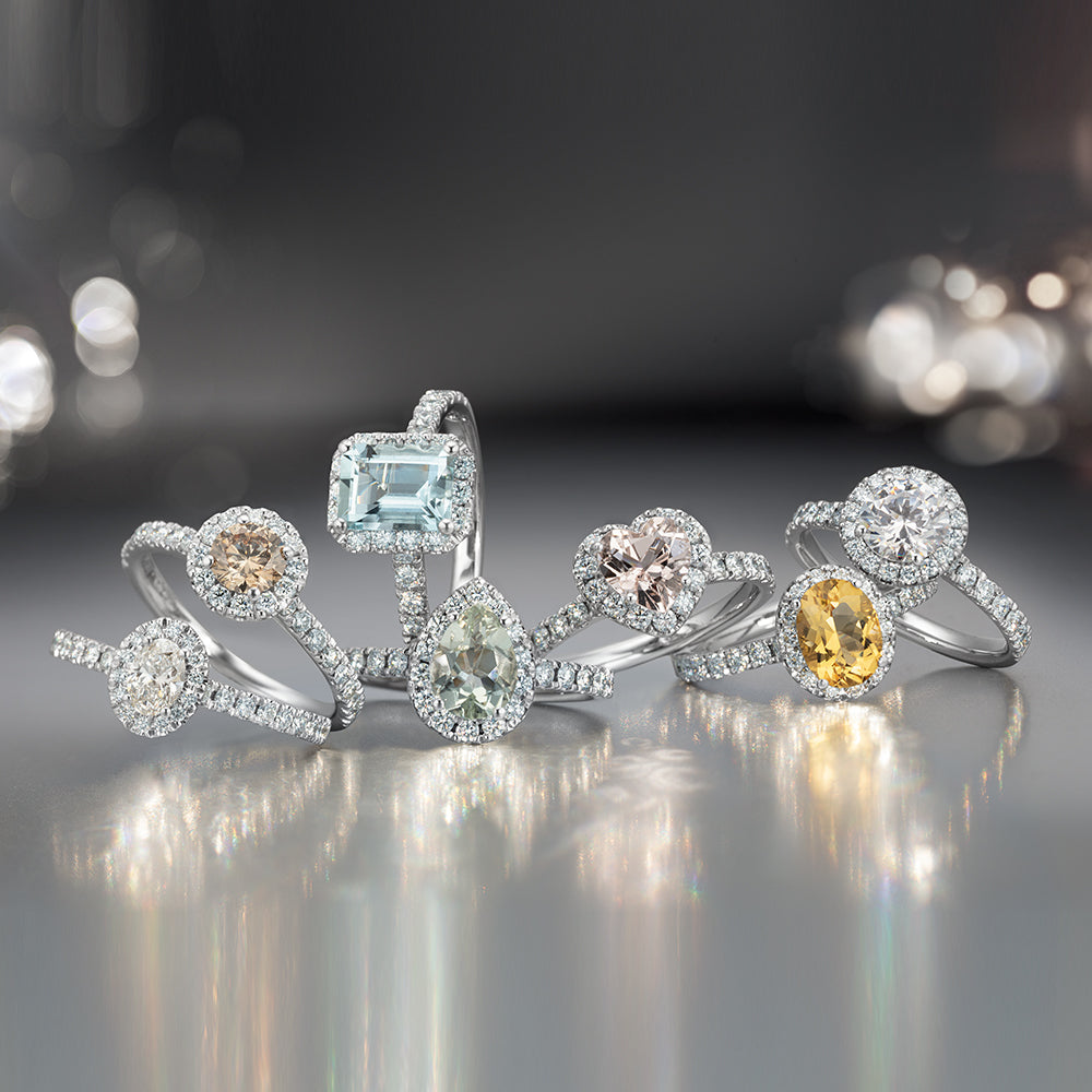Die Liebe hat viele Facetten – wie die Steine der umwerfend schönen Solitär-Schmuckstücke der Shades of Love Kollektion, die zu besonderen Anlässen geschenkt und ein Leben lang getragen werden können. Im Mittelpunkt leuchtet ein Diamant oder Farbstein, den es in unterschiedlichen Schliffen gibt: Rund, Oval, Tropfen, Baguette-Form und natürlich als Herz. Den funkelnden Rahmen bilden kleine Diamanten, die auch die Ringschiene schmücken. Variationswünsche werden erfüllt!