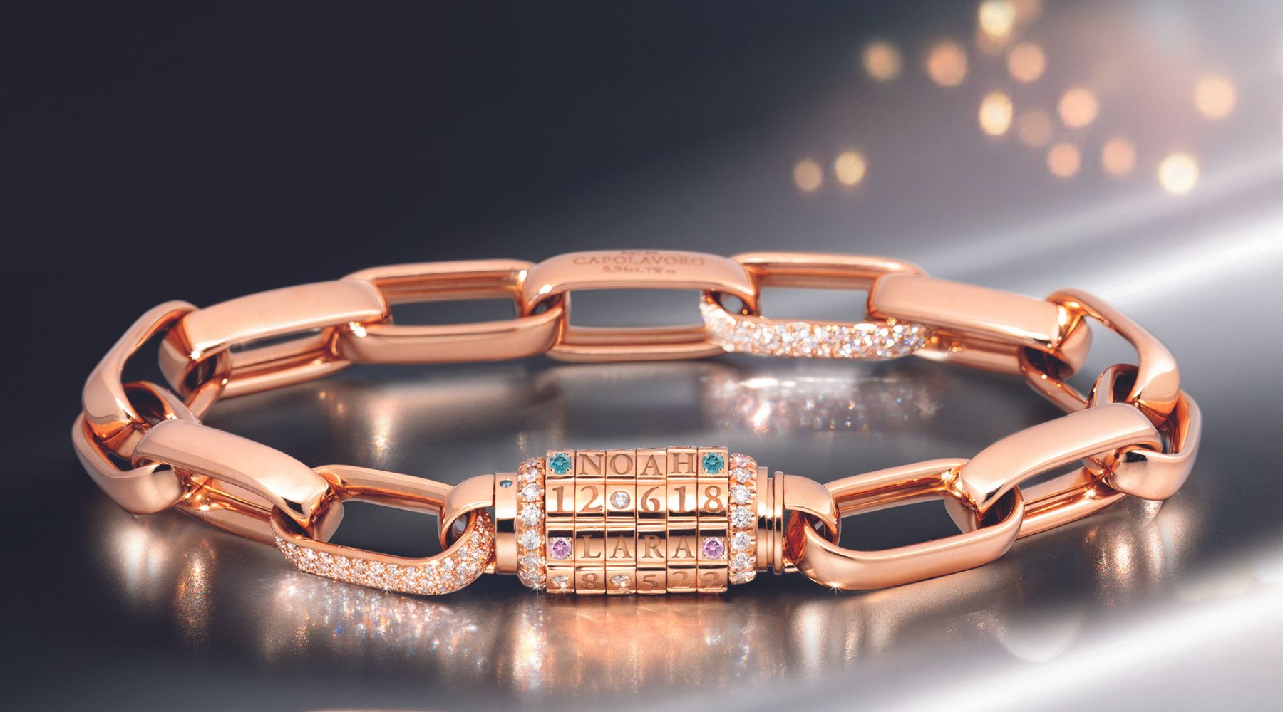 Andrea: My Memory Lock carries our family history in its heart. The opening code is the wedding date of your daddy and me. The names of your three children adorn other lines. I find the colored diamonds in my favorite color, "blue," particularly enchanting - they always remind me of our vacations and the deep blue sea.